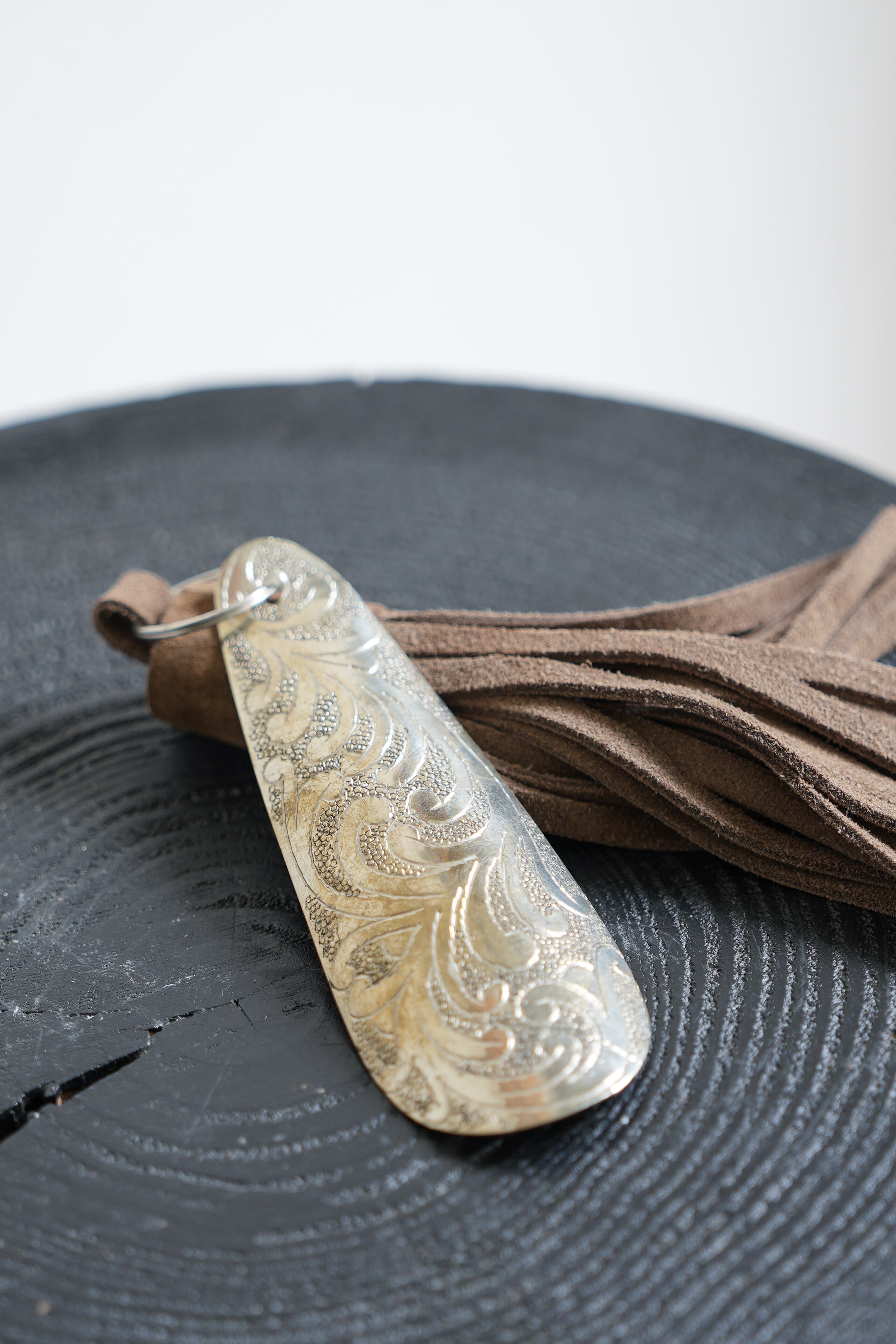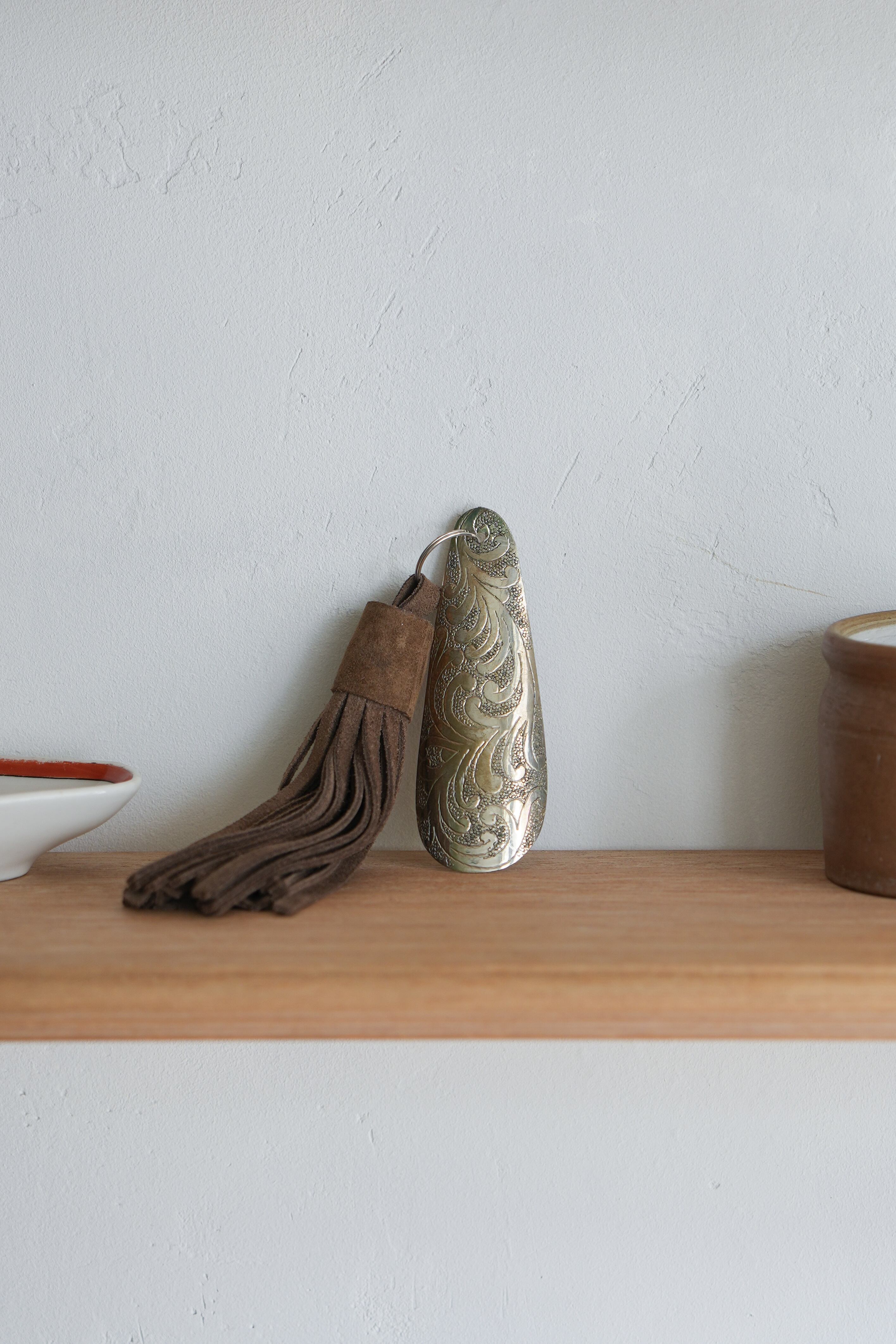 モロッコ・マラケシュの職人さんが作る靴べらです。 本体 洋白製 付属タッセル(スウェード) 本体金属部17.5cm(タッセル込み全長27.5cm)×幅3.2cm